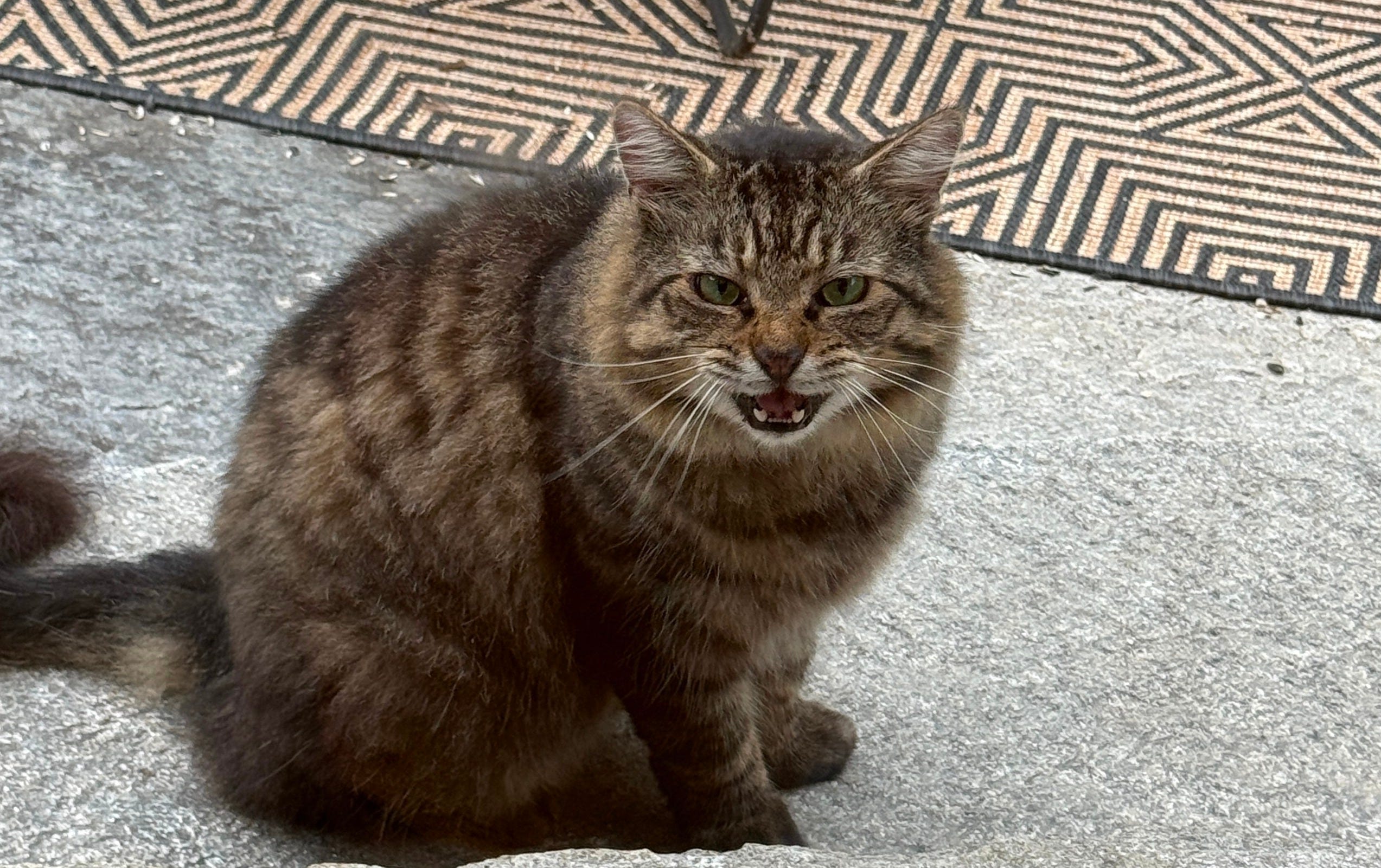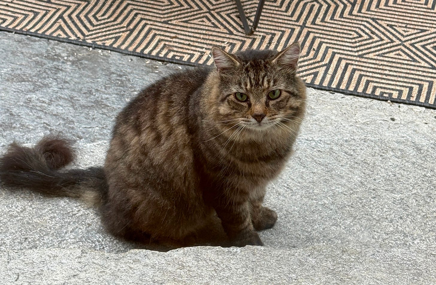 Finally, my dream came true. A new (stray) cat just walked up my driveway and made herself at home on my patio. She has a chewed up tail, a rough and ready disposition, and she is thoroughly enjoying all of the tasty cat food I am providing. How will this story evolve? Stay tuned. For now, we are calling her Lisa Murkowski, and she is a delight. As my son said, she looks like she could eat our pretty housecats in CHUNKS, and I think that might be true?